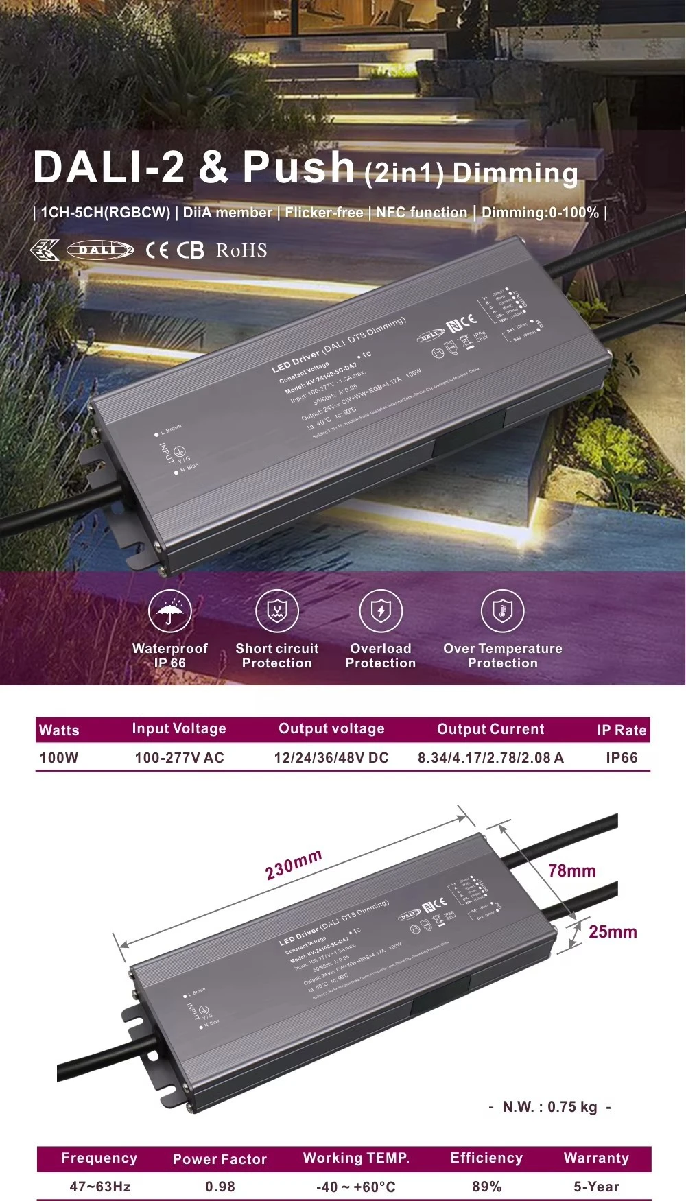 Ağıllı idarəetmə, möhkəm qorunma və çox yönlü gücü bir kompakt, etibarlı vahiddə birləşdirən gələcəyə davamlı təməl üçün 100W DALI-2 Sürücüümüzü seçin.