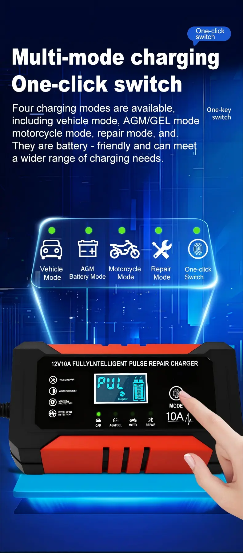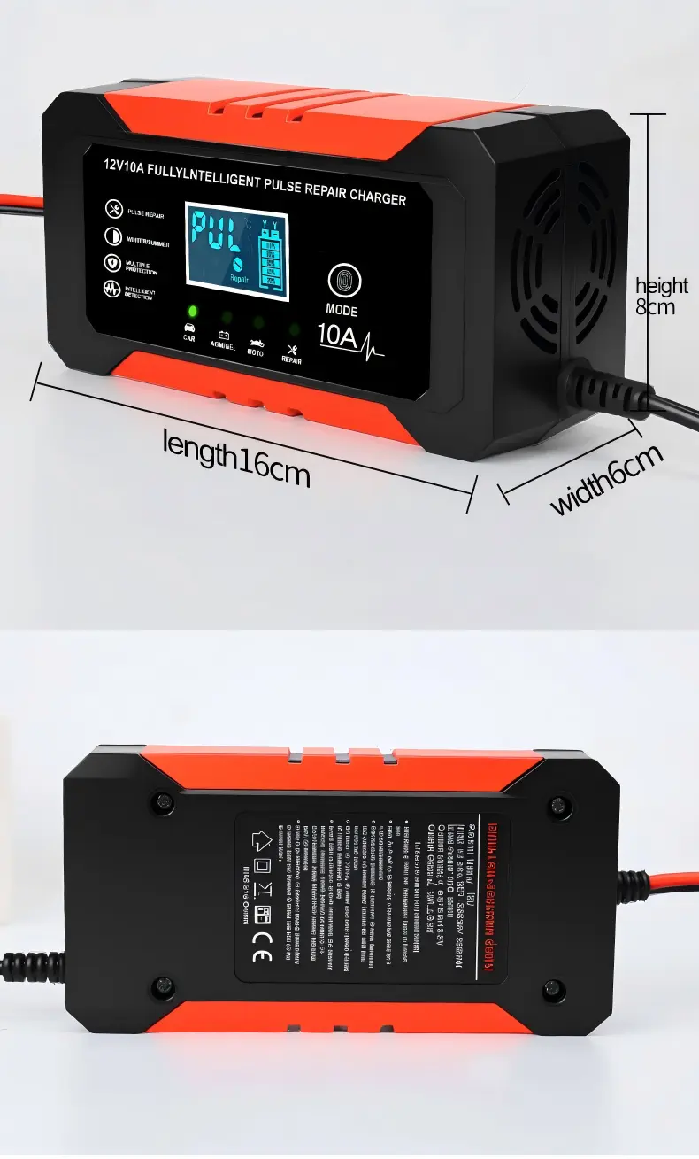 Dəqiq texniki spesifikasiyalarla təchiz edilmiş bu ağıllı akkumulyator şarj cihazı 110~230V AC (50/60Hz) universal giriş gərginliyi diapazonuna malikdir və bu, bütün dünyada elektrik şəbəkələri ilə uyğunluğu təmin edir. O, 10A doldurma cərəyanı ilə sabit 12V DC çıxışı təmin edir, akkumulyatorları tez bir zamanda doldurmaq üçün ardıcıl güc verir – 100Ah qurğuşun-turşu batareyasını təxminən 10 saat ərzində tam doldurmağa qadirdir, standart 5A şarj cihazları ilə müqayisədə xeyli sürətli. 95%-dən çox enerji səmərəliliyi ilə enerji tullantılarını minimuma endirir, eyni zamanda onun yığcam alüminium korpusu (170×90×50mm, 1.0kg) daşınma qabiliyyətini və dayanıqlığını təmin edir.