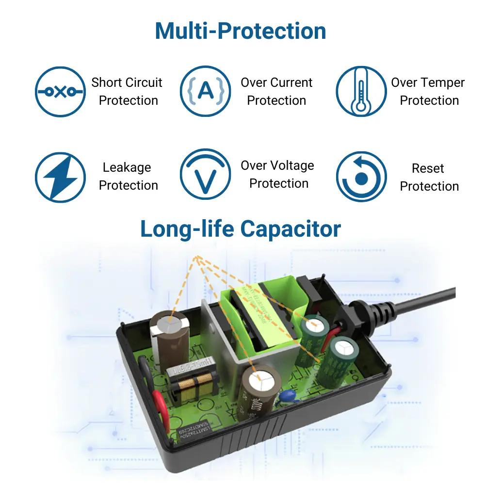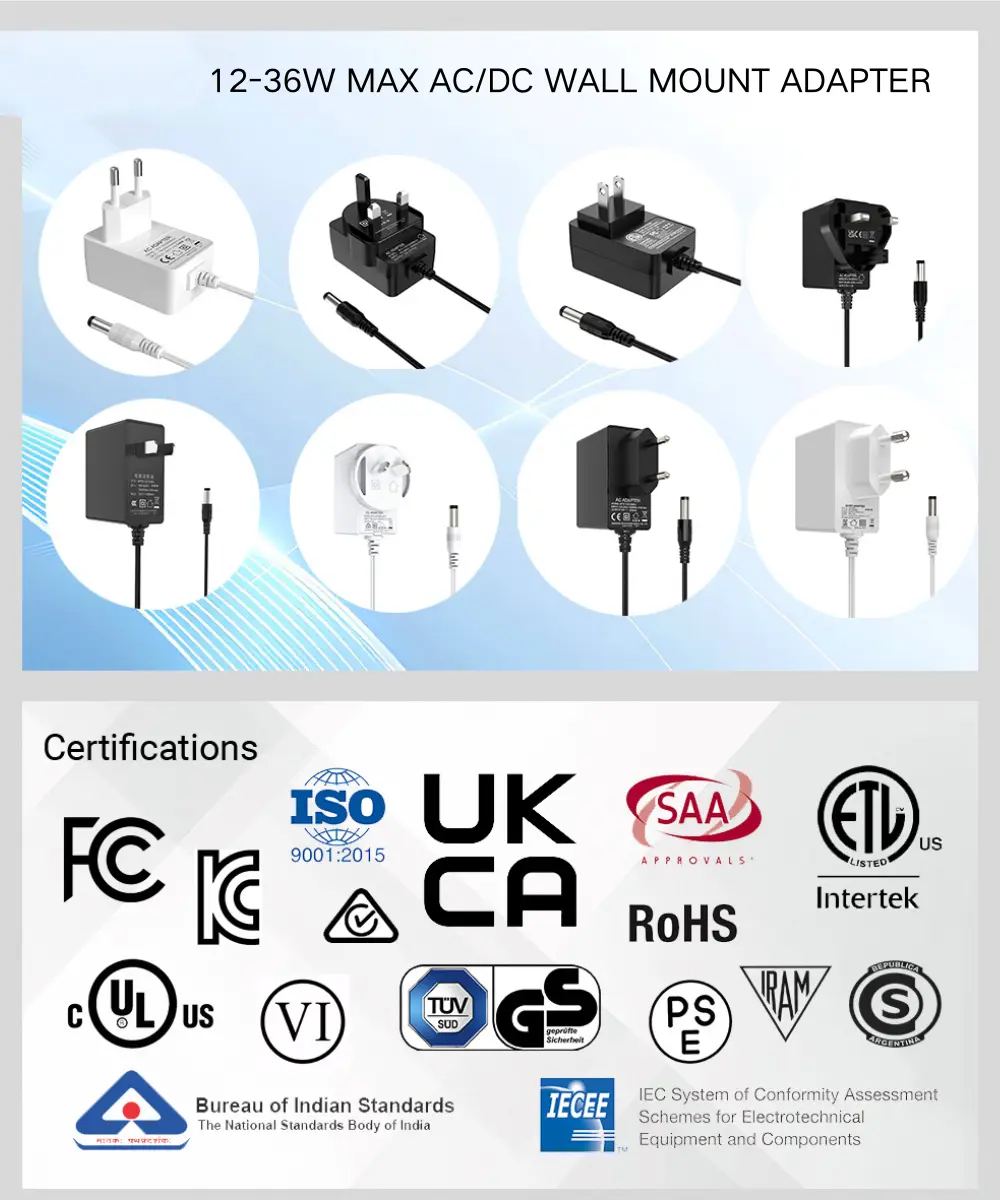 Onun yığcam plug-in dizaynı məkana qənaət edir. Sabit və ardıcıl 12W çıxış güc adapterini təmin etmək, marşrutlaşdırıcılar, şəbəkə açarları, LED zolaqları və müxtəlif cihazlar üçün mükəmməl uyğundur.