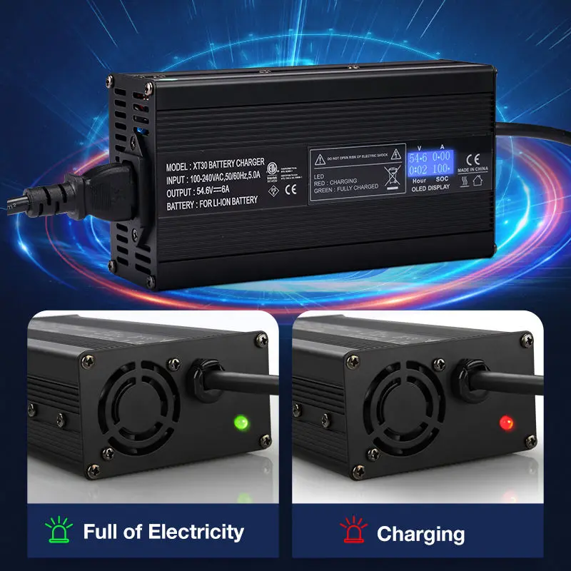 STARWELL fabriki tərəfindən istehsal edilmiş, Elektron Velosiped Sürətli Şarj Cihazı üçün Topdan 12V 24V 48V CE Qurğuşun turşusu LiFePO4 Avtomatik Akkumulyator Doldurucusu. O, elektrikli velosipedlər, skuterlər və digər elektrikli nəqliyyat vasitələri üçün sürətli, təhlükəsiz və səmərəli enerji doldurmanı təmin edir.