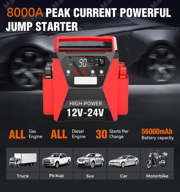 STARWELL yüksək performanslı 12V/24V Avtomobil Sürətli Başlanğıc Ağıllı Batareya Şarj Cihazını təqdim edir, akkumulyatorun saxlanması və təcili işə salınmasında etibarlılıq və zəka axtaran avtomobil sahibləri üçün oyun dəyişdiricisi. 8000A pik cərəyanı və 4000A başlanğıc cərəyanı ilə təchiz edilmiş bu iki gərginlikli ağıllı akkumulyator şarj cihazı möhkəm gücü ağıllı texnologiya ilə birləşdirərək, onu bütün qaz mühərrikləri və 15L-ə qədər olan dizel mühərrikləri üçün uyğun edir, avtomobilləri, yük maşınlarını, RV-ləri, motosikletləri, qayıqları və hətta ağır yük maşınlarını əhatə edir.