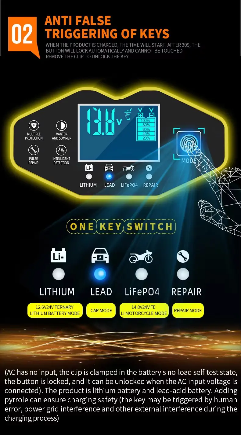 Əlavə funksiyalara batareyanın təmiri, gücün bərpası və avtomatik temperatur kompensasiyası daxildir. Quraşdırılmış təhlükəsizlik mühafizəsi tərs polariteyi, qısaqapanmanı, həddindən artıq cərəyanı və həddindən artıq istiləşməni əhatə edir, həm yeni başlayanlar, həm də təcrübəli istifadəçilər üçün rahatlıq təmin edir.
