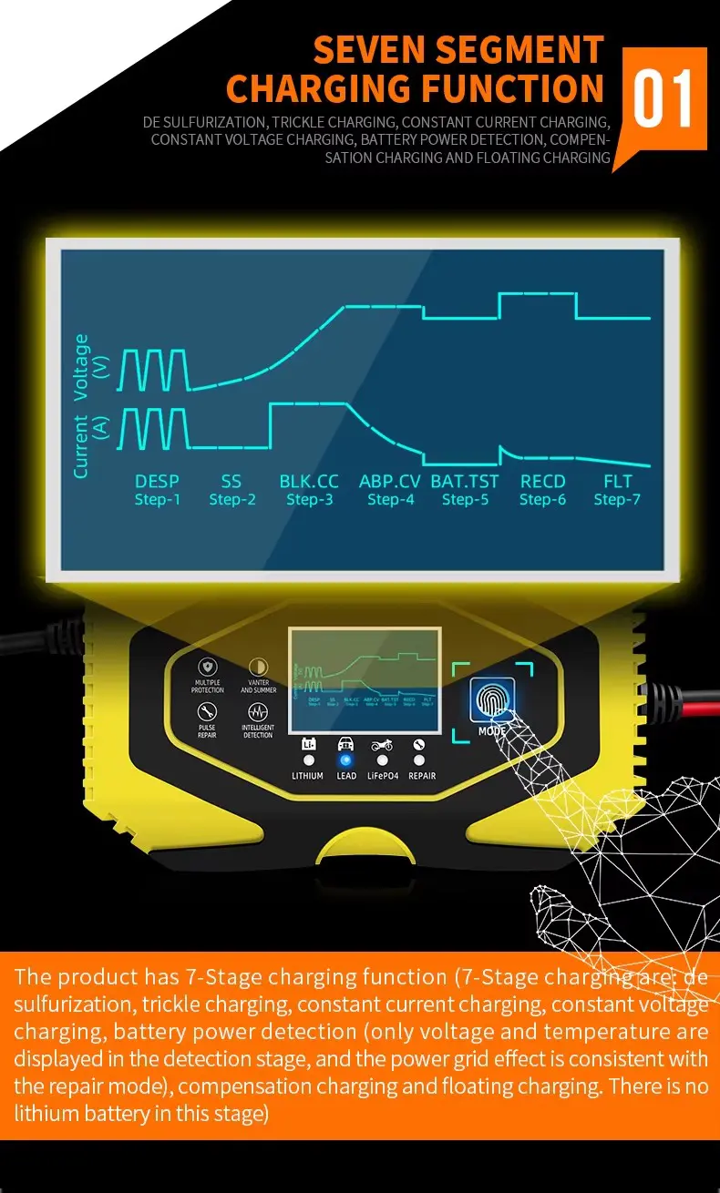 7 mərhələli doldurma proqramı akkumulyatorun optimal baxımını təmin edir: desulfasiya, yumşaq işə salma, toplu doldurma, udma, analiz, yenidən işlənmə və float baxımı. Bu mərhələlər batareyanın ömrünü uzatmaq, sulfatlanmış batareyaları bərpa etmək və həddindən artıq yüklənmənin qarşısını almaq üçün birlikdə işləyir.