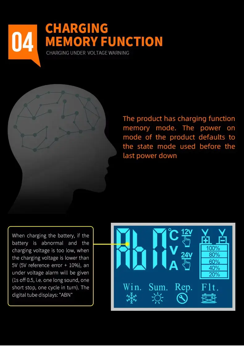 2. Optimallaşdırılmış Doldurma Performansı Bu şarj cihazı 6A-da 12V və 3A-da 24V təmin edir, maksimum çıxış 110W və tam yükdə 85% doldurma səmərəliliyi ilə. Avtomatik 7-mərhələli ağıllı doldurma proqramına desulfasiya, yumşaq başlanğıc, toplu doldurma, udma, təhlil, yenidən işlənmə və float baxımı daxildir. Xüsusi Qış Rejimi soyuq temperaturda təhlükəsiz enerji doldurmağı təmin edir, LCD displey isə real vaxt rejimində şarj gərginliyinə, cərəyanına və batareyanın temperaturuna nəzarət etməyə imkan verir.