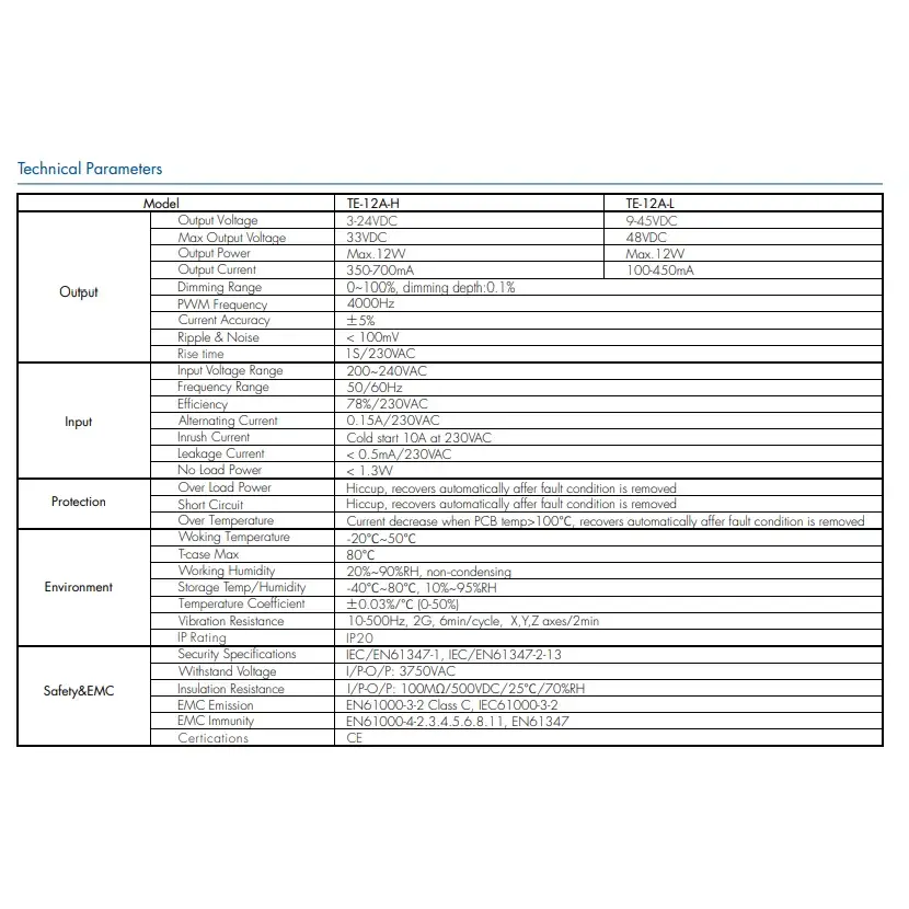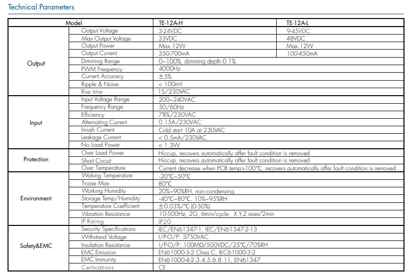 Giriş gərginliyi: 200-240VAC 50-60Hz Giriş cərəyanı: 0.15A Çıxış Gücü: 12 Watt Maks Çıxış gərginliyi: 9~42V Zəmanət: 2 il Sertifikat: CE/Rohs