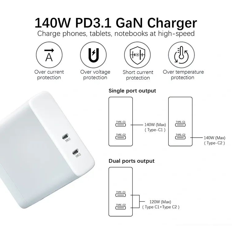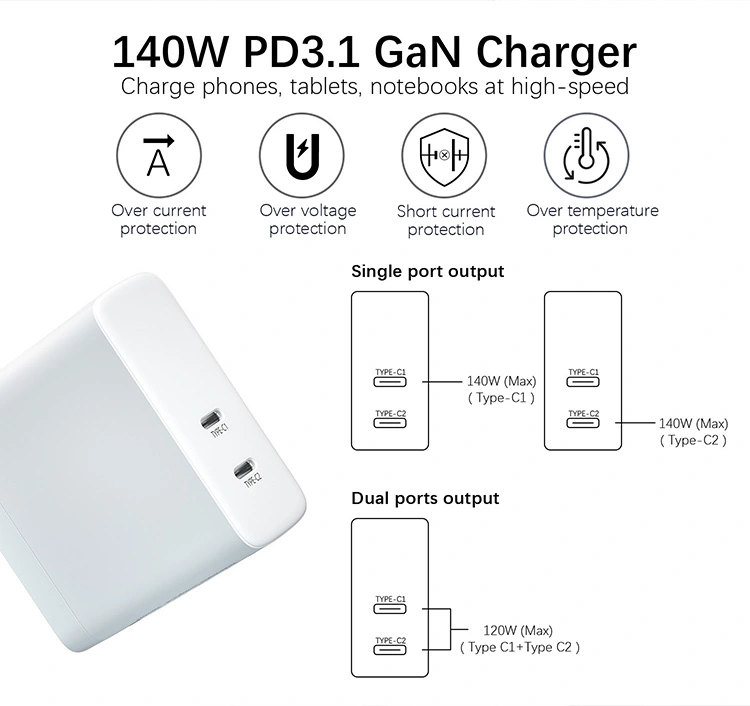 140w Dual USB C Port PD şarj cihazı ABŞ-ın qatlanacağı: Tək portu 140W gücünə qədər təmin edə bilər. İkiqat limanlar çıxış gücü eyni vaxtda ayrılır. Bir laptop və cib telefonu eyni zamanda şarj edərkən səmərəliliyi dəyişməz olaraq qalır.