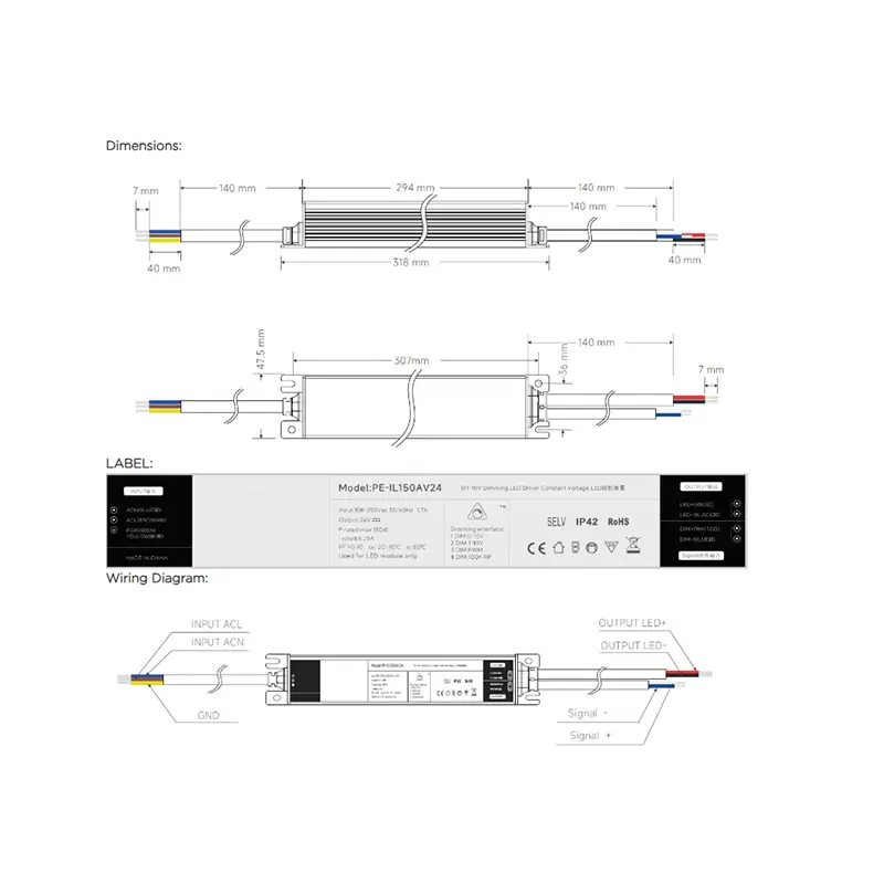 Standart 0-10V qaralma interfeysi ilə təchiz edilmiş, bazarda ən aparıcı dimmerlərlə uyğunlaşan parlaqlığın 1%-dən 100%-ə qədər hamar tənzimlənməsini dəstəkləyir. 95%-ə qədər yüksək enerji səmərəliliyi və 100-277V geniş AC giriş diapazonu ilə öyünən o, beynəlxalq layihələr üçün mükəmməl olan qlobal gərginlik standartlarına asanlıqla uyğunlaşır.