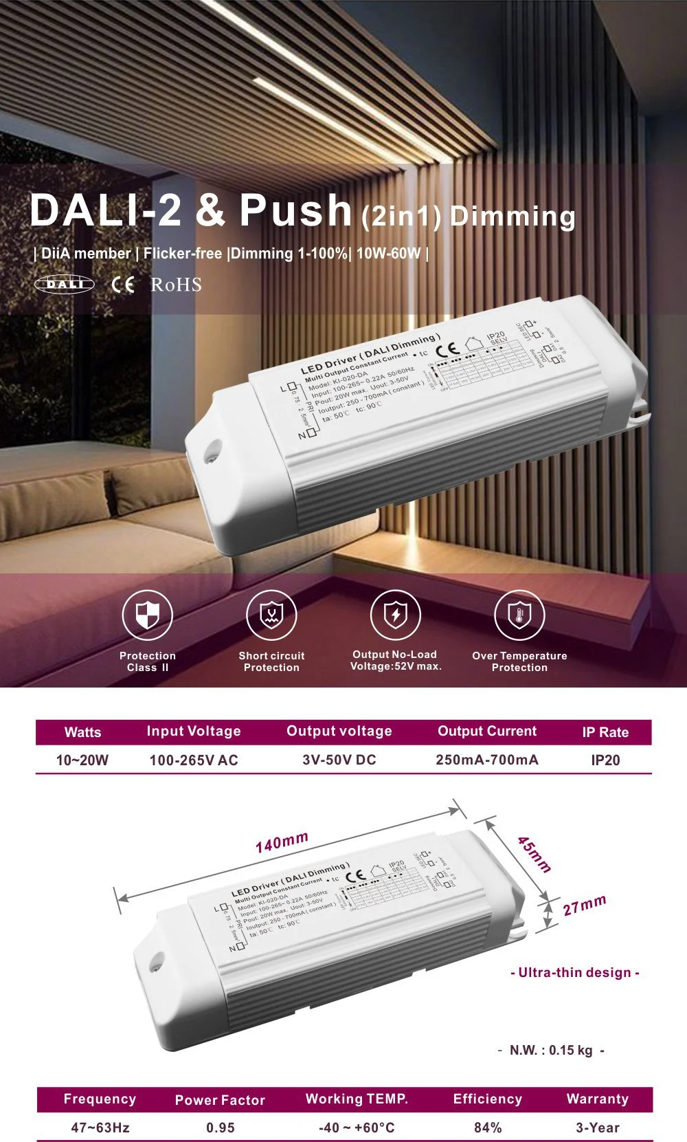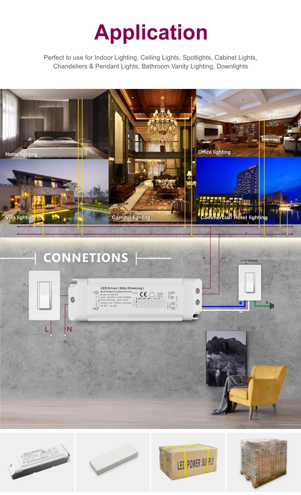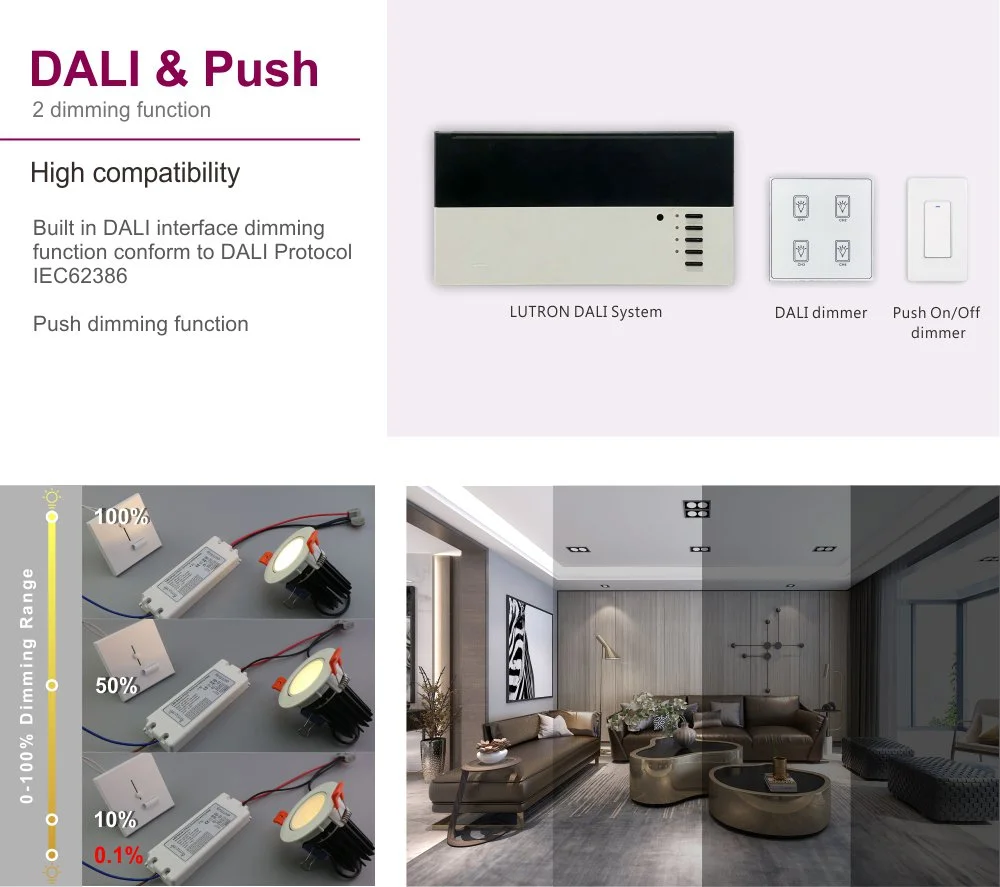 Onun yığcam dizaynı quraşdırma və inteqrasiyanı asanlaşdırır, həddindən artıq gərginlik, həddindən artıq temperatur və qısaqapanmadan hərtərəfli qorunma təmin edir. Məhsul muzeylər, ofislər və otellər kimi səhnə əsaslı işıqlandırma nəzarəti tələb edən yerlər üçün uyğundur və səmərəli enerjiyə qənaət və çevik işıq mühitinin idarə edilməsinə nail olmaq üçün ideal sürücü həllidir.
