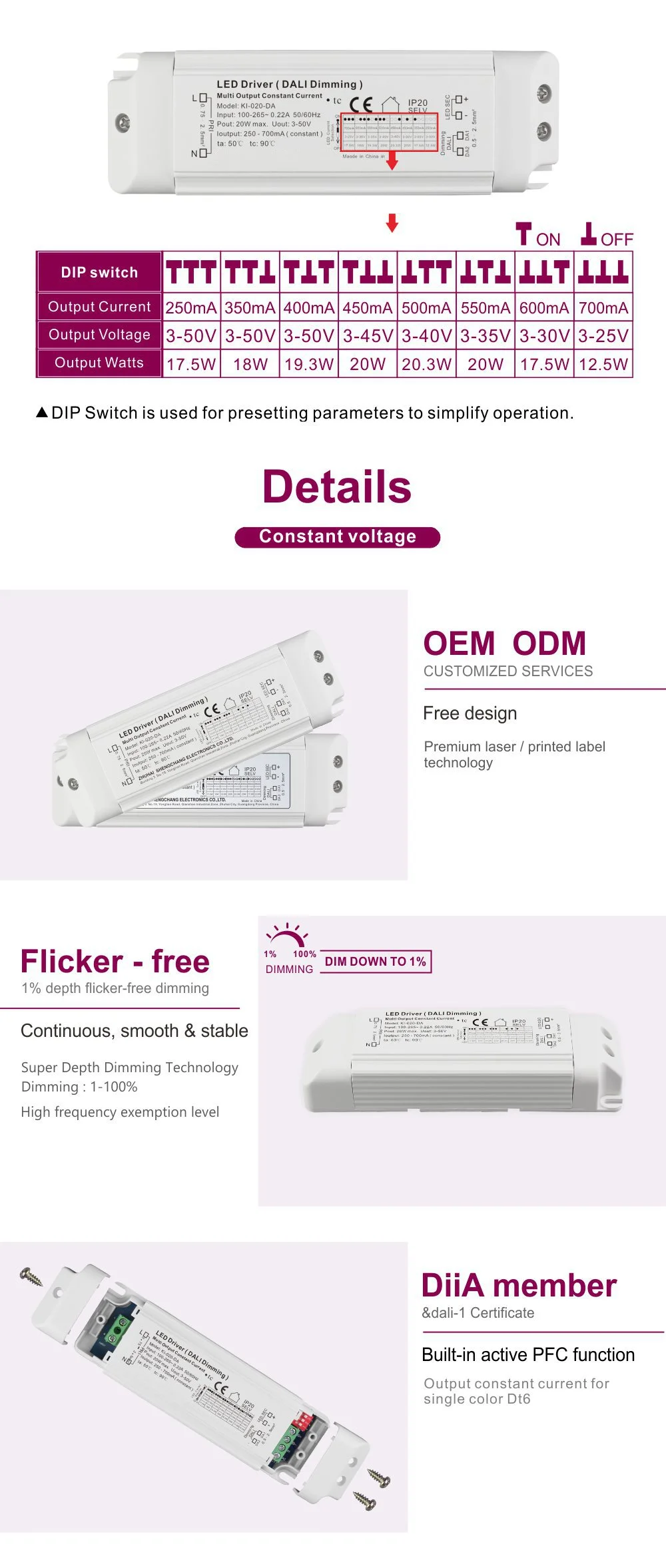 LED işıqlar üçün etibarlı 20W Dali qaralma sabit cərəyan enerji təchizatı olaraq, LED modulları və ya işıq zolaqları üçün təmiz və titrəməyən sabit cərəyan təmin edir. Məhsulun korpusu LED İşıqlandırma üçün Dimmable 20W LED Sürücü AC-DC Sabit Cərəyan Plastik Korpusunu qəbul edir, əla istilik yayma performansına malik yığcam və möhkəm struktura malikdir və həm daxili, həm də xarici quraşdırmanı dəstəkləyir.