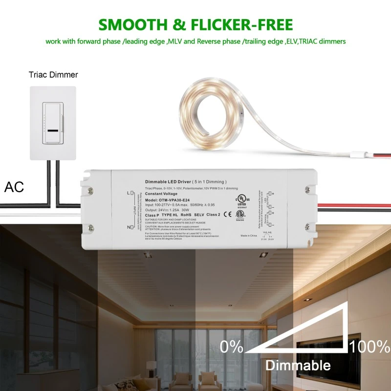 3. Yüksək Səmərəlilik və Enerjiyə Qənaət: STARWELL yüksək keyfiyyətli 30 Vt 24 V Triac Qaranlıq Led Sürücüsü 88%-ə qədər çevirmə səmərəliliyinə və ≤ 0,5 Vt yüksüz gücə malik aşağı enerji istehlakına malikdir və bu, uzunmüddətli enerji xərclərini azaltmağa kömək edir.