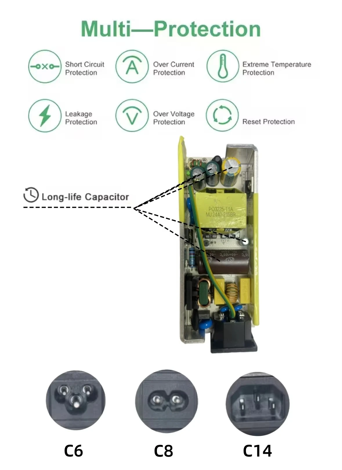 Kompleks Təhlükəsizlik Mühafizələri: Həddindən artıq cərəyandan qorunma (OCP), Həddindən artıq gərginlikdən qorunma (OVP) və qısaqapanmadan qorunma (SCP) daxil olmaqla inteqrasiya edilmiş qorunma vasitələri həm adapterin, həm də qiymətli avadanlıqlarınızın zədələnməsinin qarşısını alır.