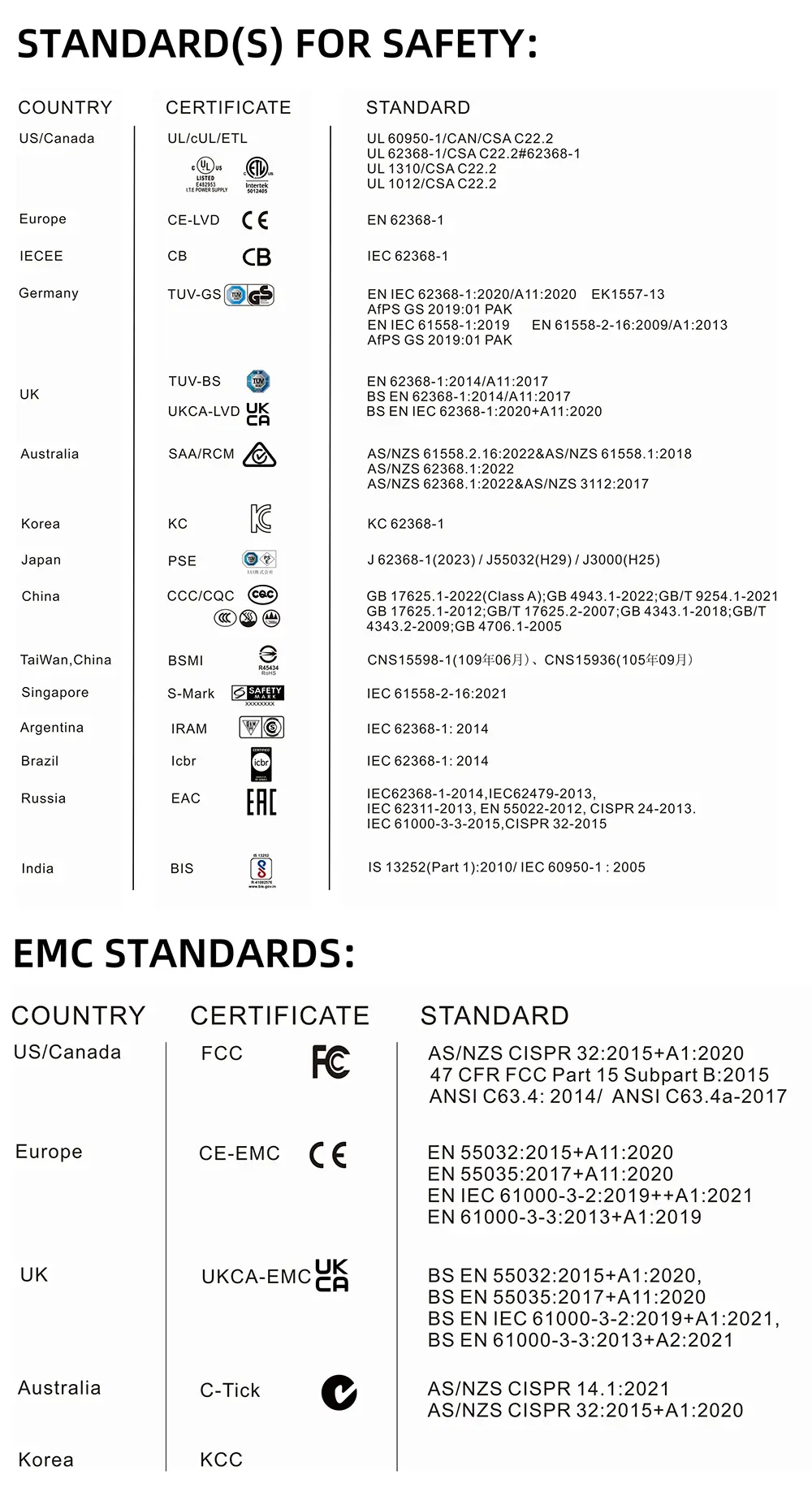 Sizin təhlükəsizliyiniz hər şeydən önəmlidir. Bu adapter ciddi beynəlxalq standartlara cavab vermək üçün nəzərdə tutulmuş və istehsal edilmişdir ki, bu da yalnız etibarlı performansı deyil, həm də rahatlığı təmin edir. O, təhlükəsizlik, sağlamlıq və ətraf mühitin mühafizəsini tənzimləyən ETL CE FCC TUV GS CB PSE KC KCC BIS SAA RCM c-Tick CCC UKCA UL cUL RoHS ilə uyğundur.