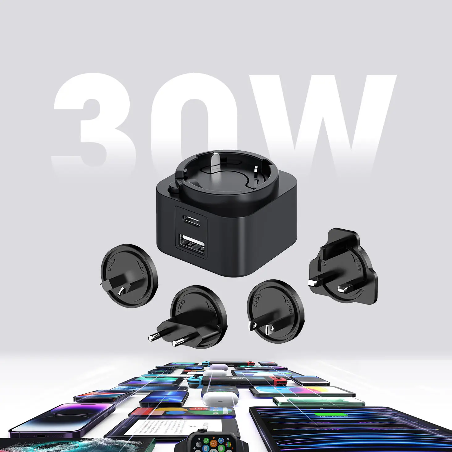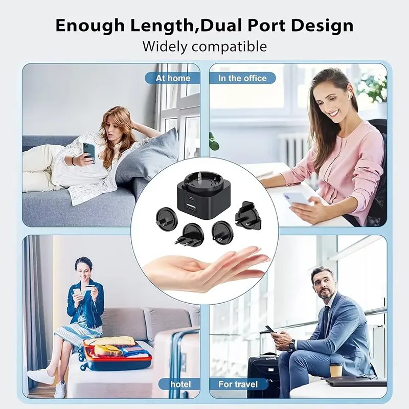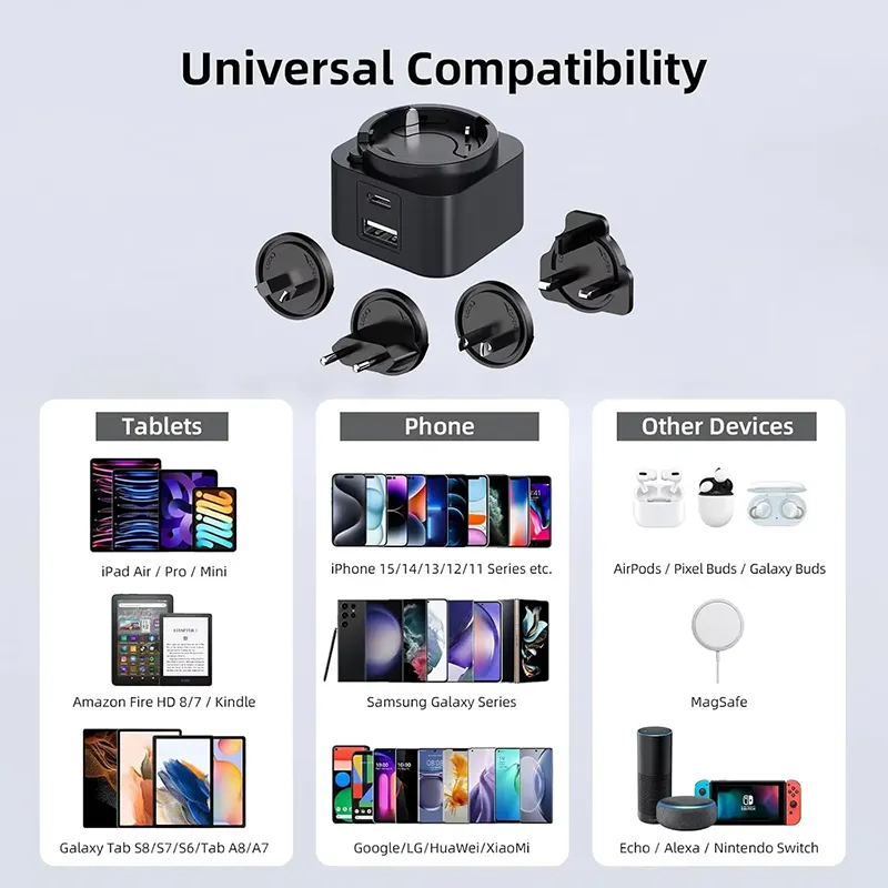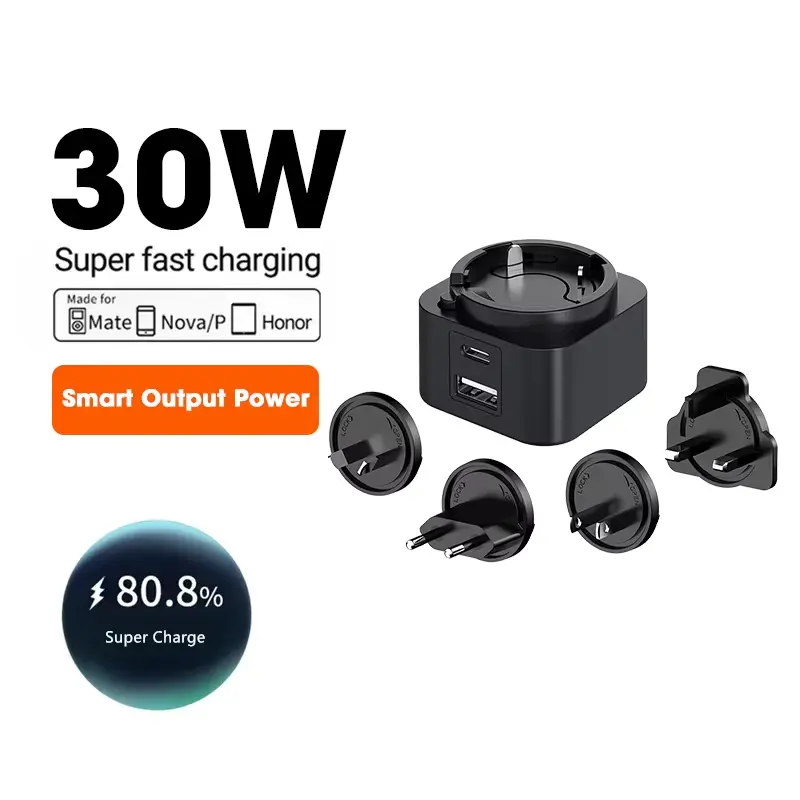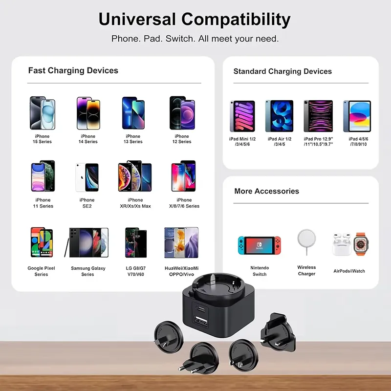 Çox yönlülük əsasdır. İkiqat port dizaynı (USB-C / USB-A) eyni vaxtda iki cihazı doldurmağa imkan verir. 30W dəyişdirilə bilən plug PD şarj cihazı bir-birinə dəyişdirilə bilən fişlər (ABŞ / AB / UK / AU) bir sıra, onu dünyada mükəmməl səyahət yoldaşı halına gətirir. Bir smartfon, tablet və ya laptop, universal uyğunluq doldurulmağınızın ən yüksək performansını təmin edir.