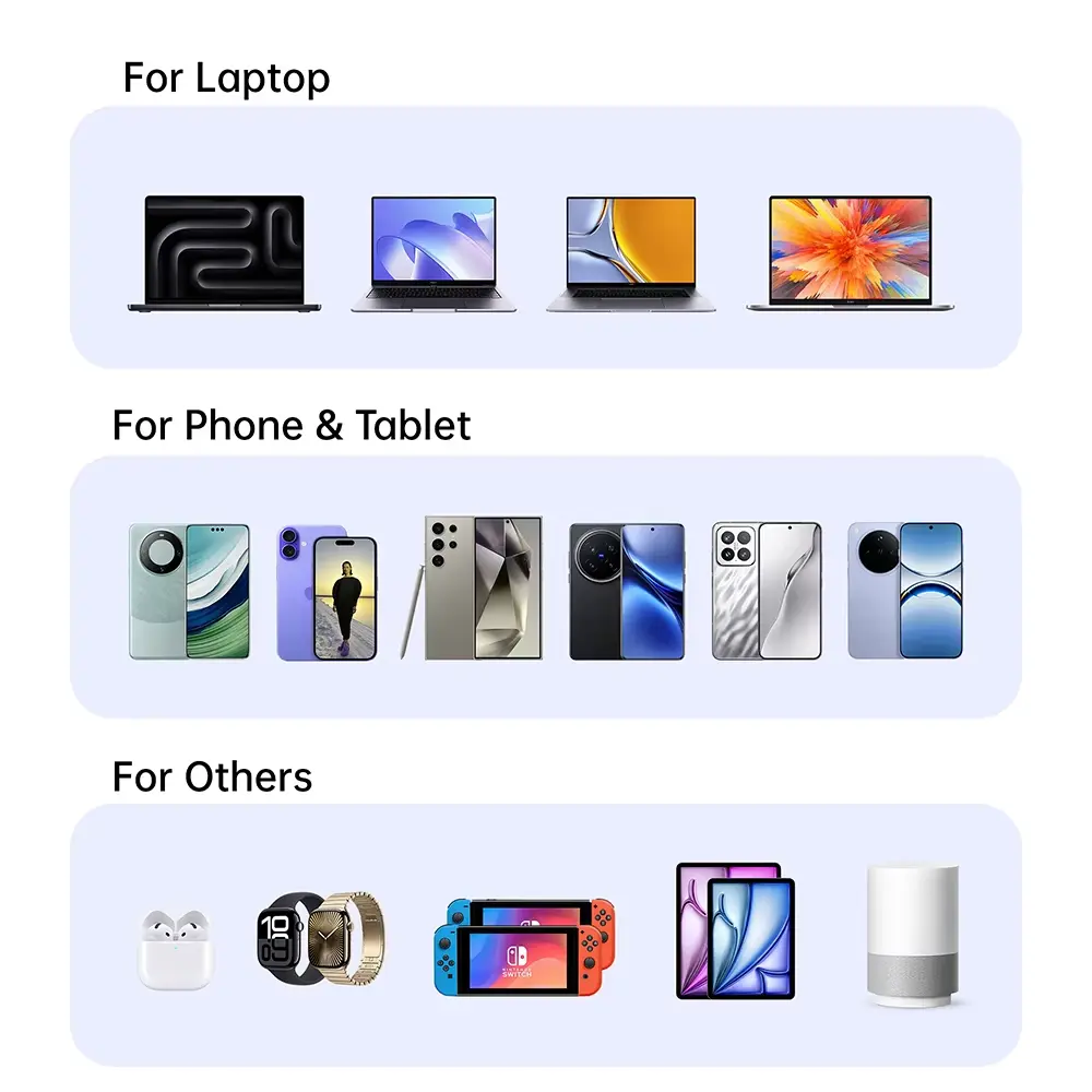 Cib telefonları, qulaqlıq və oyun aksesuarları da daxil olmaqla USB-C cihazları ilə uyğun gəlir. Təhlükəsiz və səmərəli şarj üçün cihaz ehtiyaclarını avtomatik olaraq aşkar edir. 4.Travel hazır taşınabilirlik