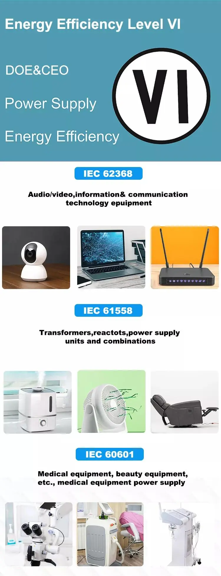 IEC62368, istehlakçı elektronikası üçün IEC60335, IEC60335, IEC60601 üçün IEC61558, IEC61558, IEC61558, IEC61558, IEC61558, IEC61347 LED işıqlandırma üçün IEC61347. |
