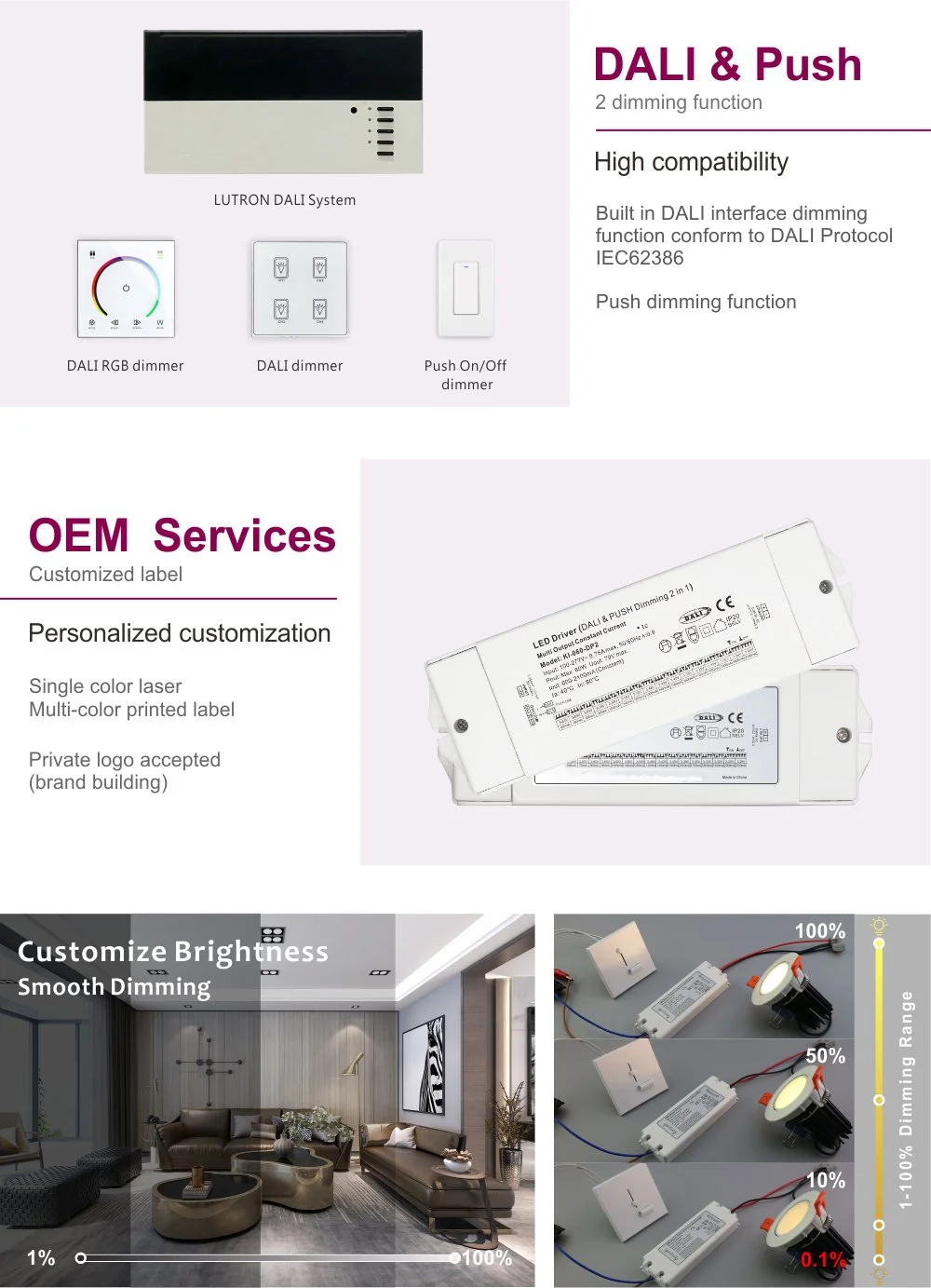 Məhsul karartma açarlarının əsas funksiyasından kənara çıxaraq ən son DALI-2 protokol standartına ciddi şəkildə riayət edir. Bu, titrəmə və səs-küy olmadan 0,1%-dən 100%-ə qədər hamar, pilləsiz qaralmağa imkan verir. DALI sistemi vasitəsilə lampaların fərdi ünvanlanması, qrup nəzarəti, səhnənin əvvəlcədən təyin edilməsi (məsələn, iclas rejimi və istirahət rejimi), vaxtı təyin edilmiş tapşırıqlar və enerji monitorinqi asanlıqla əldə edilə bilər. O, binanın intellektual idarəetmə sisteminə mükəmməl inteqrasiya edir və səmərəli və enerjiyə qənaət edən ağıllı işıqlandırma yaratmaq üçün təməl daşı kimi xidmət edir.