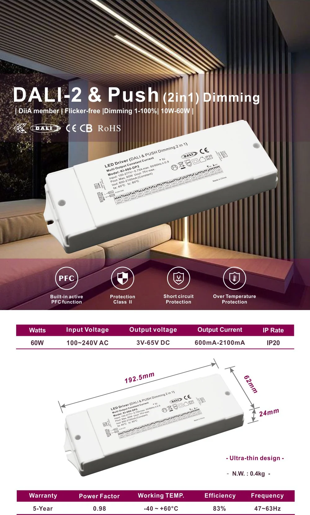 Bu sürücünün əsas məqamı onun CCT karartma funksiyasının inteqrasiyasındadır. İstifadəçilər 2700K (isti sarı işıq) ilə 6500K (sərin ağ işıq) arasında geniş rəng temperaturu diapazonunda davamlı xətti tənzimləmə həyata keçirə bilərlər. Tək lampa işıqlandırma mühiti üçün müxtəlif vaxtların və fəaliyyətlərin tələblərinə cavab verə bilər - səhər yüksək rəng temperaturlu ağ işıq canlandırmaq və təravətləndirmək, axşam isə aşağı rəng temperaturlu sarı işıq isti atmosfer yaratmaq, məkanın rahatlığını və funksionallığını əhəmiyyətli dərəcədə artırır.