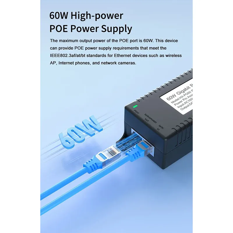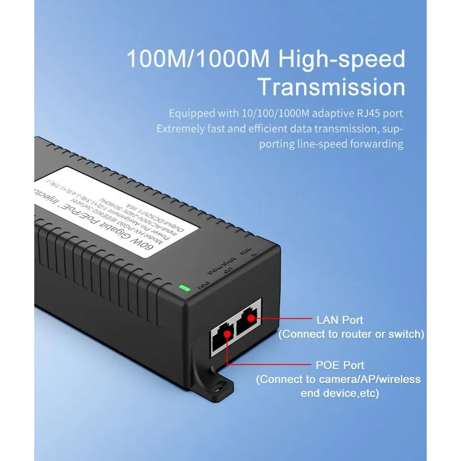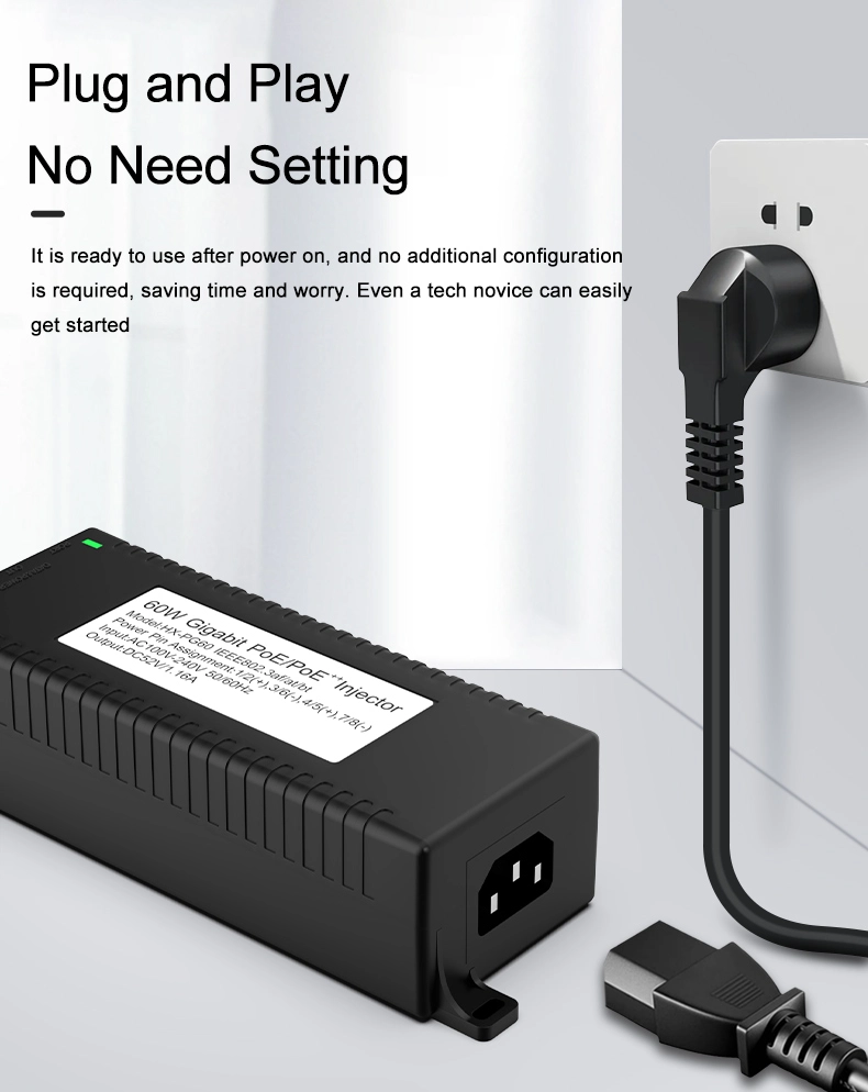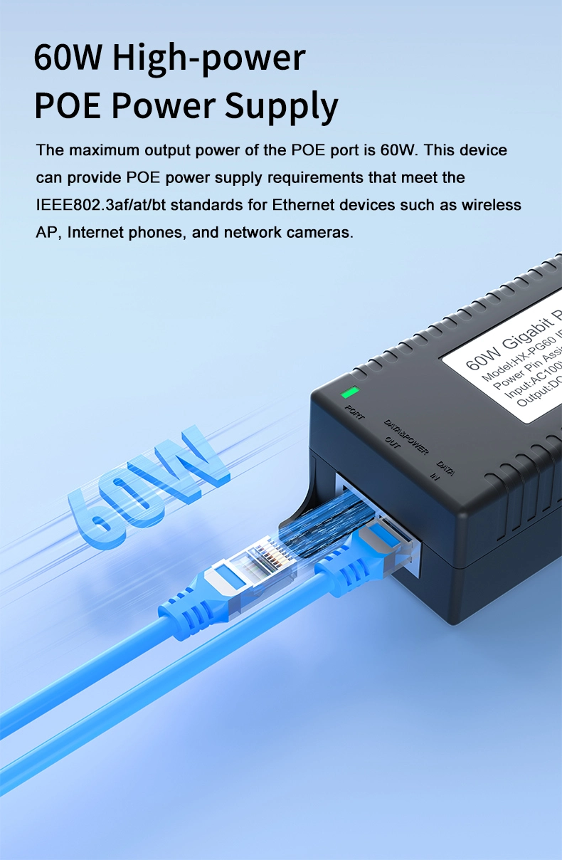 Təhlükəsizlik Nəzarəti: IP Kamera Təhlükəsizlik və Şəbəkə Cihazı üçün Gigabit 60W masaüstü POE injektoru IP kameraları və PTZ kameralarını sabit enerji ilə təmin edir.
