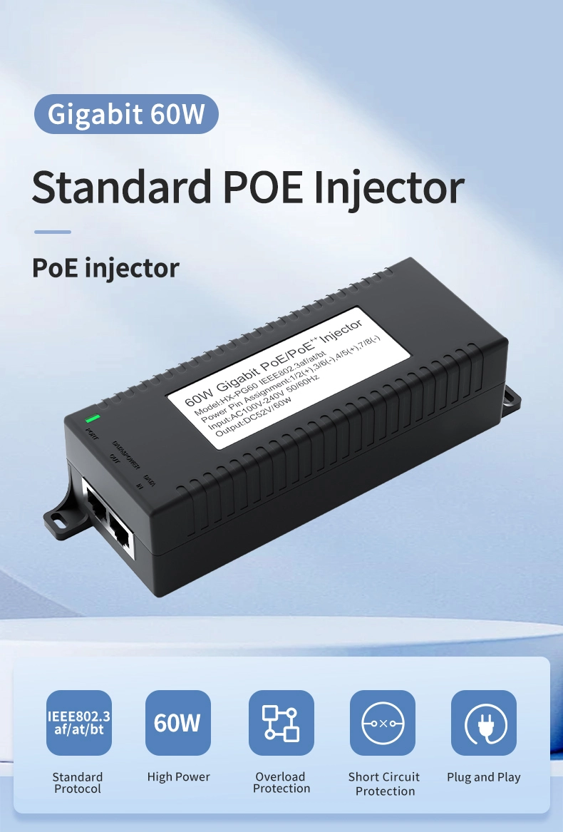 IEEE802.3AF/AT/BT ilə keyfiyyətli 60W masaüstü POE injektorunu Çində peşəkar PoE injektor istehsalçısı Starwell-dən alın. O, IEEE 802.3af/at/bt beynəlxalq standartlarına ciddi şəkildə riayət edir və şəbəkə cihazları üçün Ethernet kabelləri vasitəsilə eyni vaxtda enerji və məlumat ötürmək üçün nəzərdə tutulub. O, 60 Vt-a qədər güc çıxışını dəstəkləyir və PTZ qübbəli kameralar, yüksək dəqiqlikli kameralar, simsiz giriş nöqtələri və video telefonlar kimi yüksək güclü PoE ilə təchiz edilmiş cihazları mükəmməl şəkildə yerləşdirə və idarə edə bilər. İnjektor kompakt iş masası dizaynına malikdir və əlavə konfiqurasiyaya ehtiyac olmadan qoş və istifadə rahatlığı üçün birbaşa elektrik fişinə malikdir. O, müxtəlif quraşdırma mühitlərində terminal cihazları üçün sabit və təhlükəsiz enerji təchizatını təmin edərək, həddindən artıq cərəyan, həddindən artıq gərginlik və qısa qapanmanın qarşısını effektiv şəkildə alan ağıllı dövrə mühafizə mexanizmi ilə təchiz edilmişdir.
