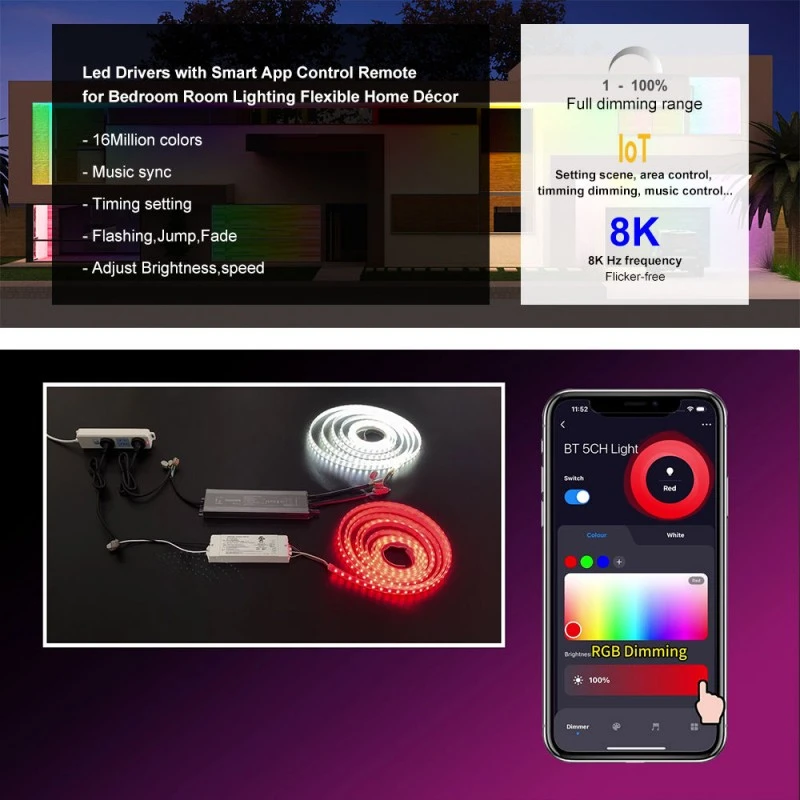 Barmaqlarınızın ucunda Ağıllı Qaralma TUYA texnologiyası ilə inteqrasiya olunmuş ZigBee simsiz moduluna sahib olan bu sürücü qüsursuz ağıllı idarəetmə təklif edir. Google Home və Amazon Echo vasitəsilə mobil proqram və ya səs əmrləri vasitəsilə parlaqlığı tənzimləyin. Yüksək tezlikli 8K Hz PWM çıxışı tamamilə titrəməsiz qaralmanı təmin edir, 1% dərinliyə malik 1-100% qaralma diapazonu isə hamar keçidlərə və mükəmməl atmosfer yaratmağa imkan verir.