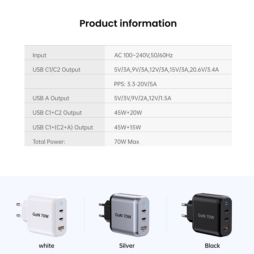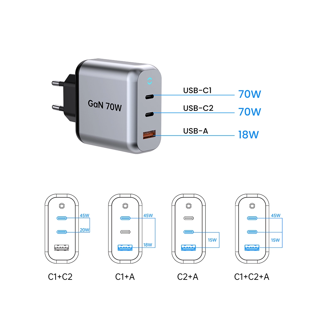 C1 / C2 çıxışı: 5v3a, 9v3a, 12v3a, 15v3a, 15v3a, 20.6v3.4a (70W Max) pps (70w max) / 3.3-11v 4.05a USB-A Çıxdı: 5v3a, 9v2a, 12v1.5a 3.3-11V 2A (22W Max) C1 + C2 çıxışı: 45w + 20w C1 + C2 + USB-A Çıxdı: 45w + 5v3a Cəmi: 70w |