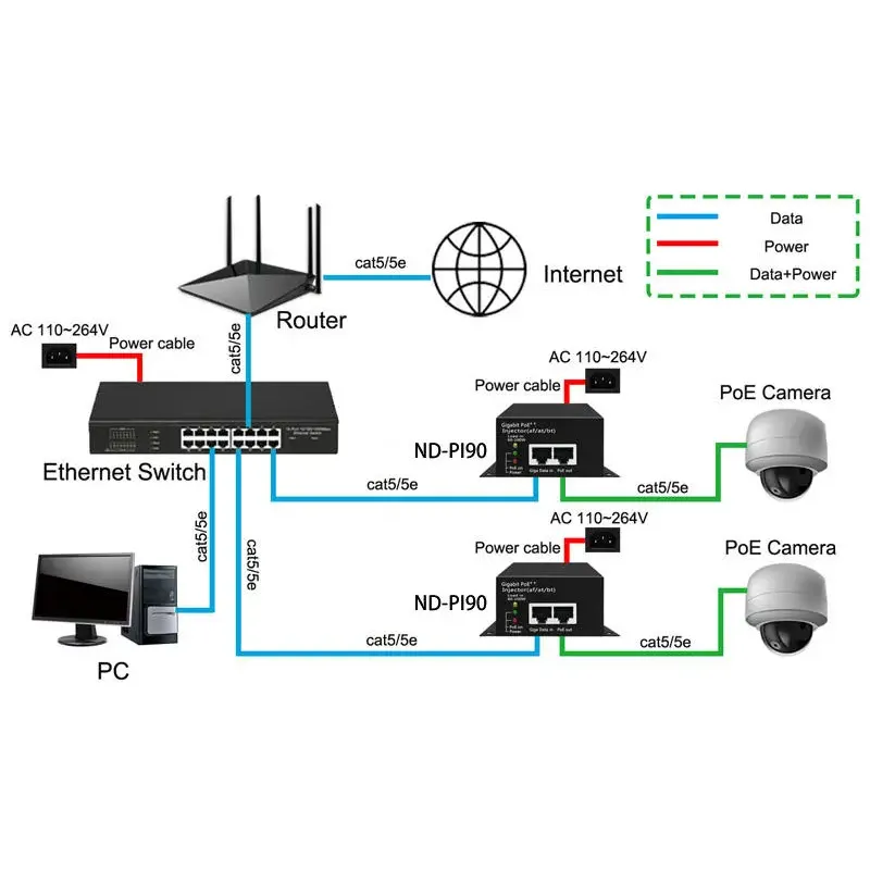 PoE məhsulları simsiz AP, şəbəkə kamerası, IP telefon və digər avadanlıqlar üçün sabit enerji təchizatı və məlumat ötürülməsini təmin etmək, naqilləri sadələşdirmək və xərcləri azaltmaq üçün standart PoE, PoE+, PoE++ və digər spesifikasiyaları təmin edir.