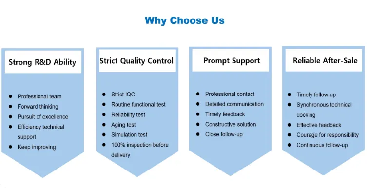 Məhsullarımız dizayndan sınaqdan tutmuş kütləvi istehsala qədər beynəlxalq standartlara və yüksək sənaye standartlarına ciddi şəkildə istinad edir və qlobal bazarda uyğunluğu və uyğunluğu təmin etmək üçün CE, FCC, RoHS, ETL və s. kimi beynəlxalq standartlara uyğundur.