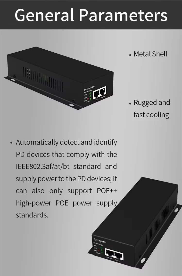* IEEE802.3bt standart protokol təsnifatı Sinif 8 ilə uyğundur. * Həcmli güc adapterləri və kabellərə tələbatı azaldın və naqil xərclərini azaldın. * 100-240V geniş AC gərginlikli giriş diapazonu. * 10/100/1000Mbps şəbəkə bant genişliyini dəstəkləyir.