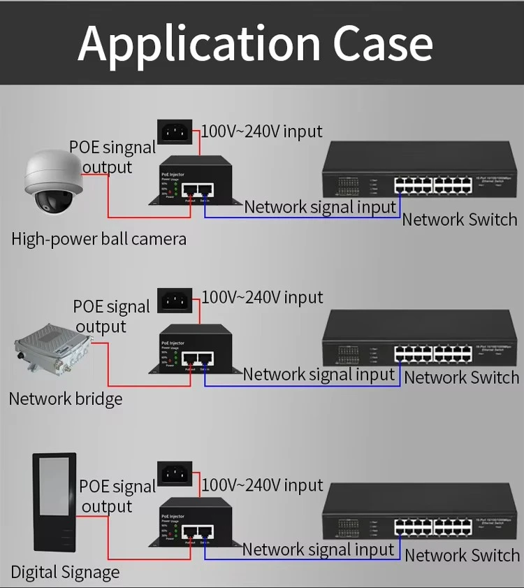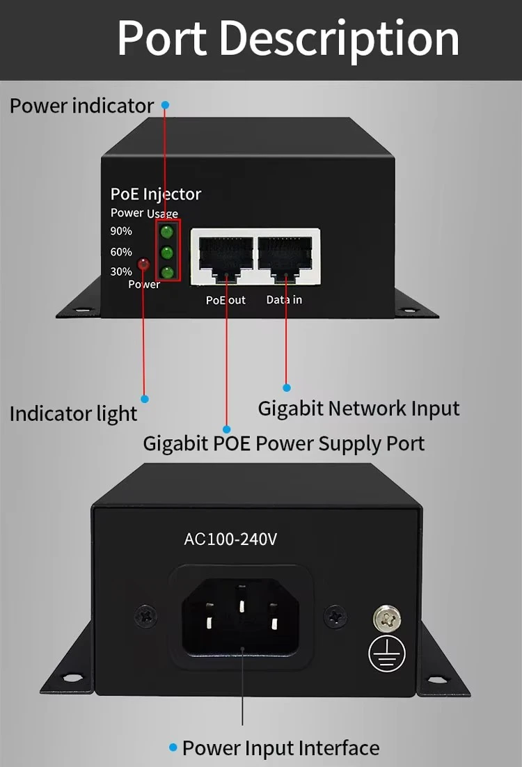 Etibarlı Güc Performansı AC100-240V giriş gərginliyi diapazonu və sabit DC48V1.25A çıxışı ilə akkumulyatorla işləyən POE injektoru bağlı cihazlara təmiz və ardıcıl 48V PoE enerjisi verir. O, 1/2,4/5(+) və 3/6,7/8(-) elektrik xəttinin əsas konfiqurasiyasını dəstəkləyir və qəbuledici tərəfdə müxtəlif PoE ilə işləyən cihazlarla geniş uyğunluğu təmin edir.