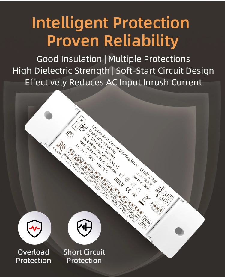 Çoxsaylı Qoruma Dizaynı: Dörd qoruyucu mexanizmlə qurulmuşdur: həddindən artıq gərginlik (mühafizə həddi ≥55V), həddindən artıq cərəyan (mühafizə həddi ≥0.18A), qısaqapanma və həddindən artıq istiləşmə (mühafizə temperaturu ≥110℃). Sürücünü və LED işıq mənbələrini zədələnmədən qorumaq üçün anormal iş şəraiti zamanı çıxışı tez kəsə bilər.
