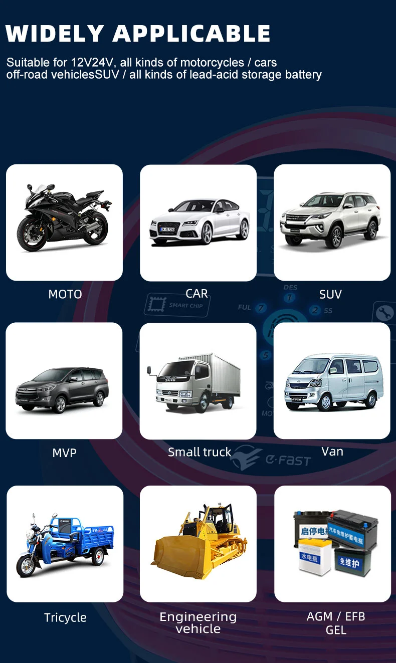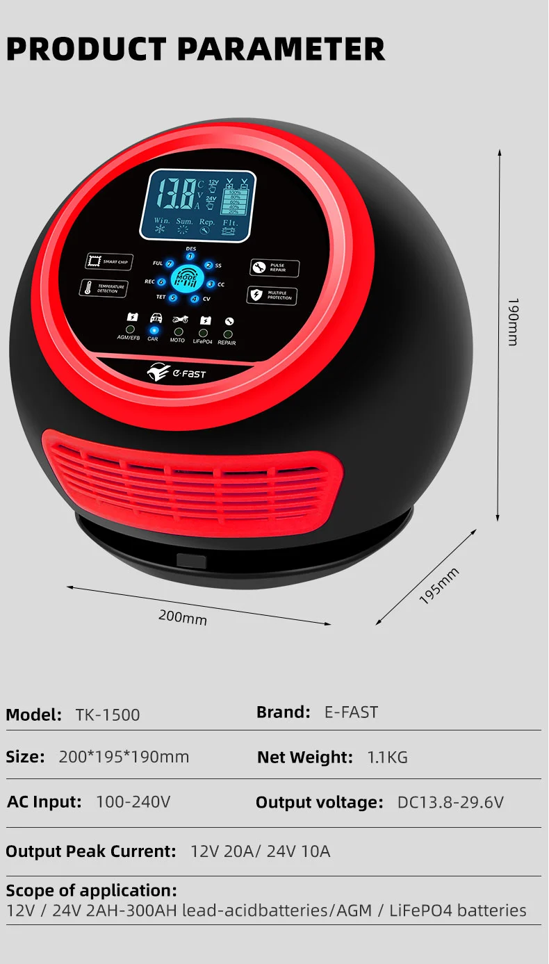 The TK-1500 is a powerful fully automatic battery charger, offering two charging modes: 12V/20A and 24V/10A. It is specifically designed for automobiles, trucks, motorcycles, boats, lawn mowers, SUVs, RVs, tractors, and all kinds of scooters. Whether it's traditional lead-acid batteries (flooded, AGM, gel, deep cycle, calcium batteries), or advanced lithium iron phosphate (LiFePO4) and lithium-ion batteries, the TK-1500 can intelligently identify and match the best charging curve, truly achieving multi-purpose functionality in one device.